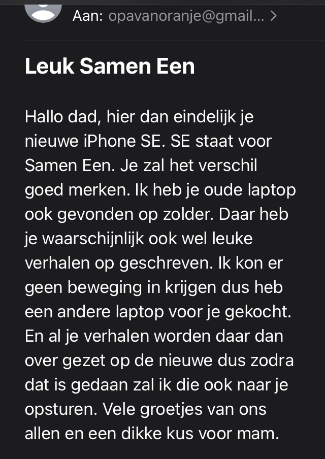Daar wordt aan de deur geklopt, hard geklopt ,zacht geklopt. wie zal dat zijn? Vast een vreemdeling zeker. Oh, hallo postbode ben jij het. Ik heb een pakketje voor Opa uit New Zeeland ,zei de post bode. Wat leuk dat is vast van de jongens. Bedankt hoor. Oma is onder tussen ook nieuwsgierig geworden. Nou open maken opa zegt Oma. Een nieuwe IPhone SE. Nou je wordt wel weer verwent. Zegt oma. Ze zijn wel vroeg je bent pas in september jarig. Dat zullen ze wel met opzet gedaan hebben zeg ik gelijk. Ik heb een beetje zitten klagen over mijn IPhone laatste keer dat ik met de jongens aan het FaceTimen was. Die oude IPhone 5 begon een beetje te storen ,ouderdom waarschijnlijk . Ik ben er blij mee zal gelijk even een e-mailtje sturen . Zal wel even een toestand worden om alles op deze Phone te plaatsen. Ga me best doen en anders moet Harry maar even aanwijzingen geven via FaceTime. Toch wel erg lief van de jongens om toch lekker vroeg mijn kadootje te sturen. Waren misschien wel ongerust dat het niet optijd zou aan komen vanwege al dat Corona gedoe. Nou Oma ga jij even koffie zetten ,ik ben even druk. Phone gelijk maar even opladen. Ga ik even een e-mailtje sturen dat mijn verjaardag s kadootje is aangekomen. Oma kom even kijken heb ook een e-mailtje van de jongens. Zal ik het even voorlezen. Dat is goed zegt Oma.